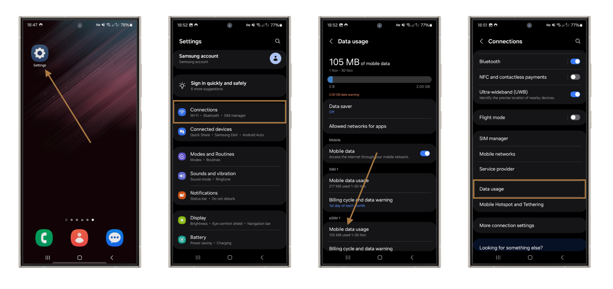 - Select Connections: Tap on Data Usage.
